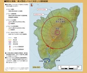 これに伴い、立ち入り規制は、火口中心から概ね1㎞以内へと変更となります。