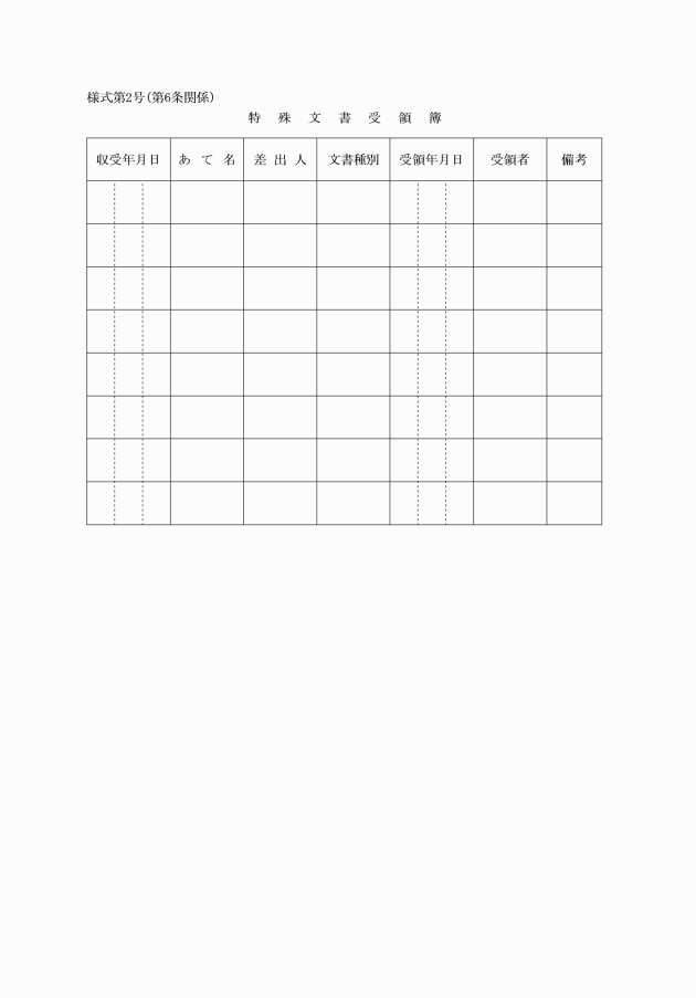 (2) 特別送達、書留、配達証明等に係る文書は、特殊文書受領簿(様式第2号)により、主務課の職員に直接配布する。この場合において、到達日時が権利の得喪又は変更に関係がある文書については、到達日時をその欄外に朱記して受付者の認印を押さなければならない。