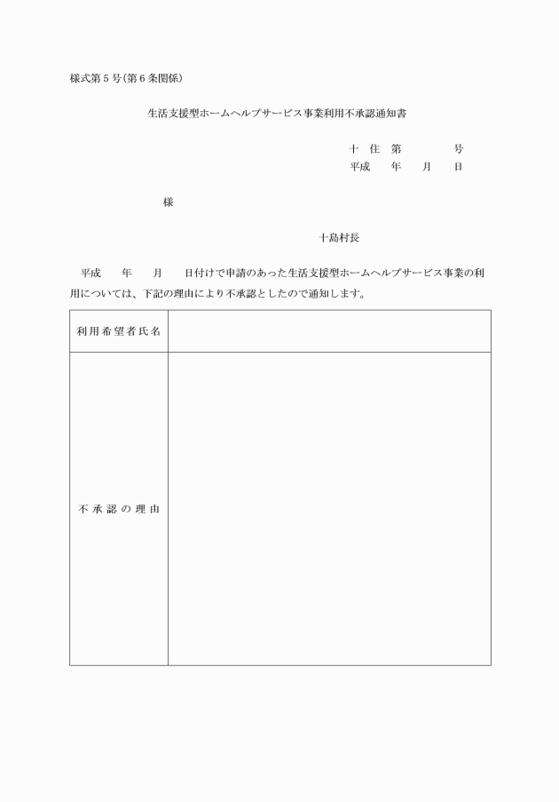 第5条 この事業を利用しようとする者(以下「申請者」という。)は、生活支援型ホームヘルプサービス事業利用申請書(様式第1号)を村長に申請するものとする。