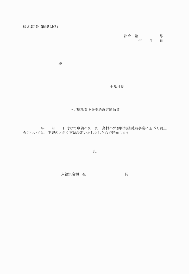 第5条 村長は、前項の申請書を審査し、適当と認めたときは、買上金額を決定し、申請者にハブ駆除買上金支給決定通知書(様式第2号)により通知するものとする。