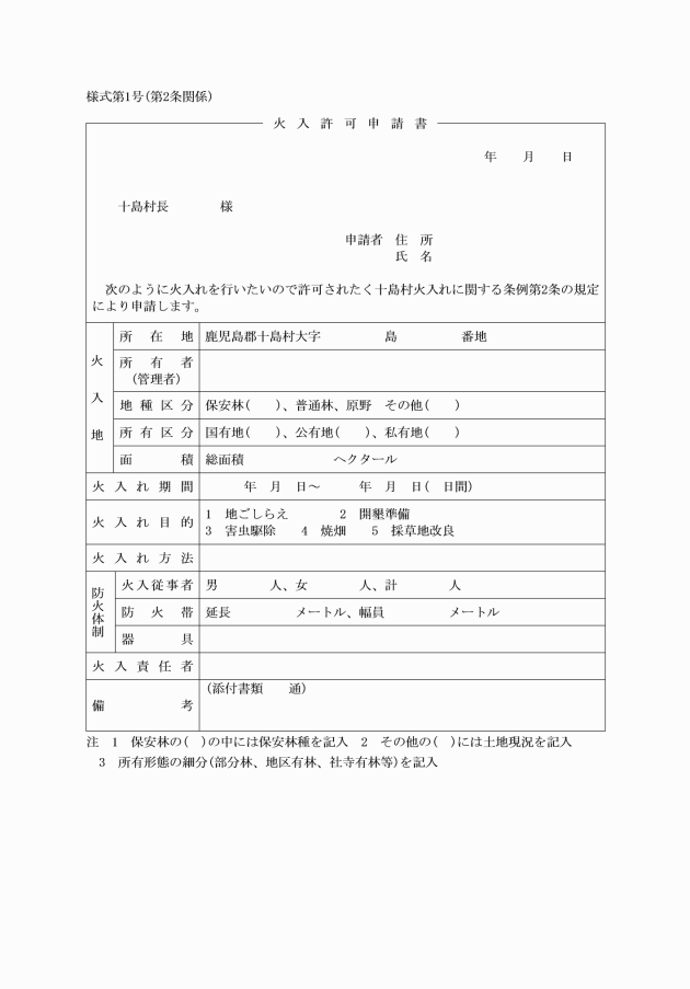 第8条 火入れの許可を受けた者(以下「火入者」という。)は、火入れを行う前日までに火入れの場所及び日時を十島村長に通知しなければならない。