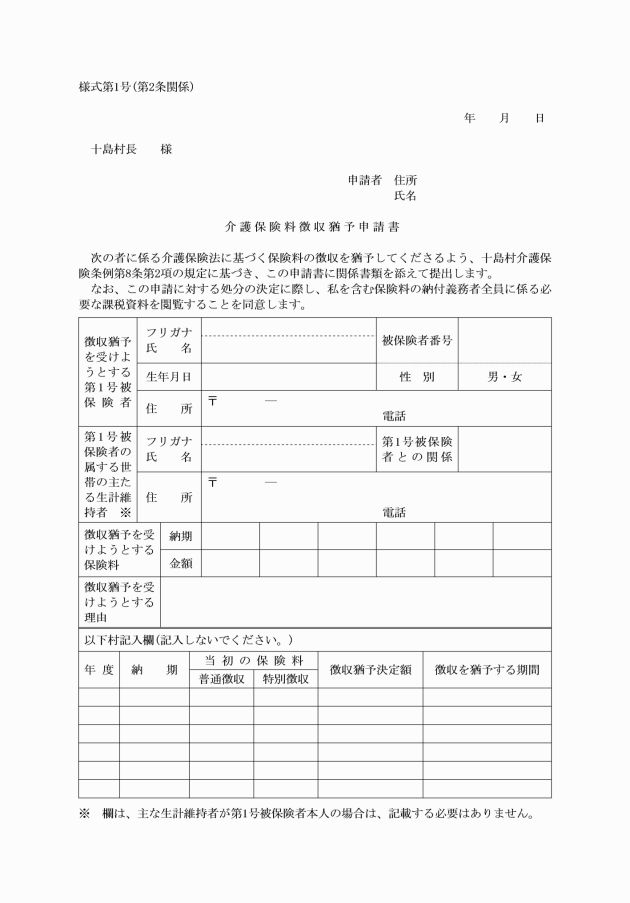 第1条 この規則は、十島村介護保険条例(平成12年条例第10号。以下「条例」という。)第11条の規定による介護保険法(平成9年法律第123号)に基づく保険料(以下「保険料」という。)の猶予の手続き並びに条例第12条の規定による保険料の減免の基準及びその手続きについて必要な事項を定めるものとする。