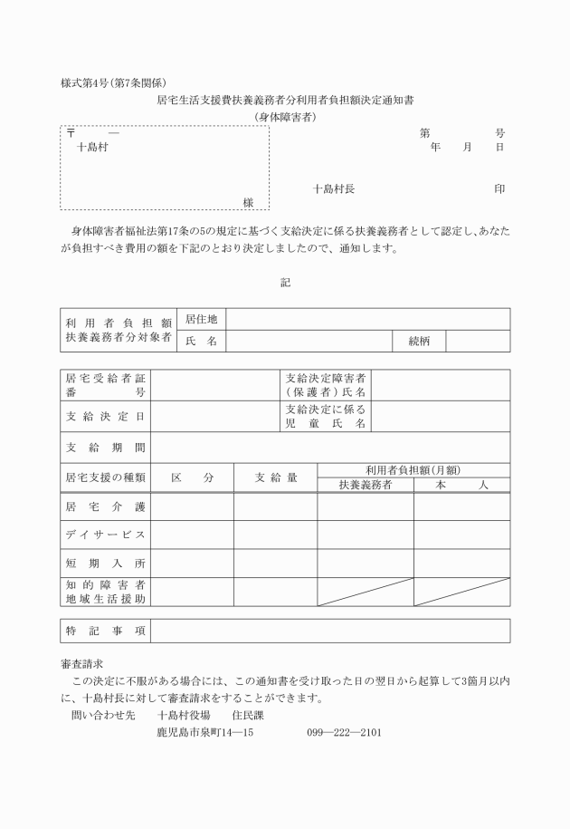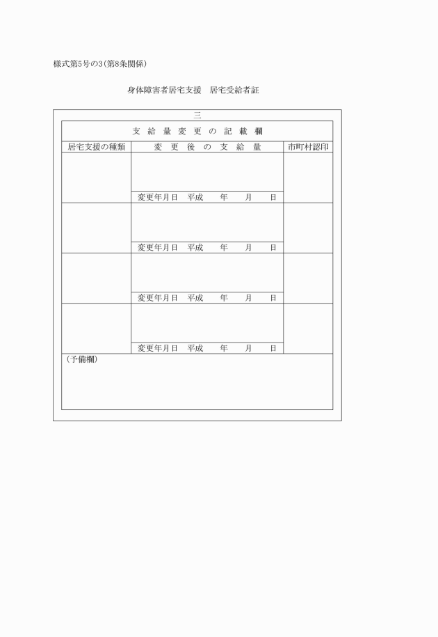 第17条 村内に居住地(居住地を有しないとき、又はその居住地が明らかでないときは現在地)を有する居宅支給決定身体障害者は、法第17条の7第1項の規定により、村長に対し、支給量の変更申請をすることができる。