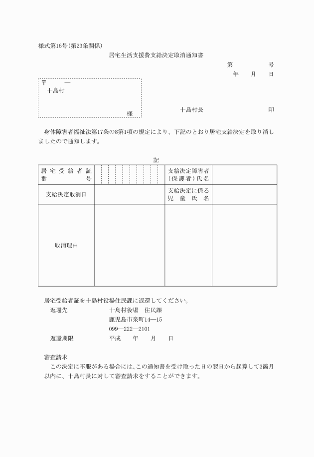 第23条 村長は、法第17条の8第1項又は法第17条の13第1項の規定により支給決定の取消しを行った場合は、次に掲げる支給決定取消通知書により通知するものとする。