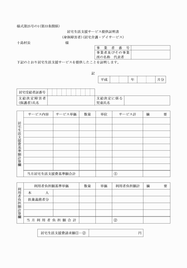 第25条 県知事から指定を受けたデイサービス事業者(以下「指定デイサービス事業者」という。)は、支給決定身体障害者と契約したとき、契約を終了したとき、及び契約支給量を変更したときは、デイサービス契約内容(居宅受給者証記載事項)報告書(様式第19号)により、その契約内容を村長に対し、遅滞なく報告しなければならない。