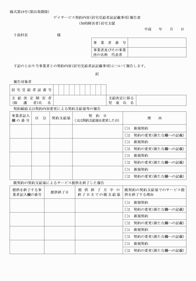 第25条 県知事から指定を受けたデイサービス事業者(以下「指定デイサービス事業者」という。)は、支給決定知的障害者と契約したとき、契約を終了したとき、及び契約支給量を変更したときは、デイサービス契約内容(居宅受給者証記載事項)報告書(様式第19号)により、その契約内容を村長に対し、遅滞なく報告しなければならない。