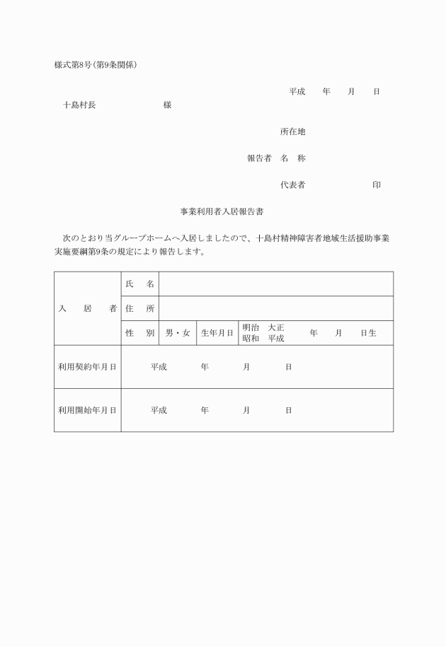 5 運営主体の長は、入居の終了に際し、事業利用者退去報告書(様式第9号)により、速やかに村長に報告しなければならない。