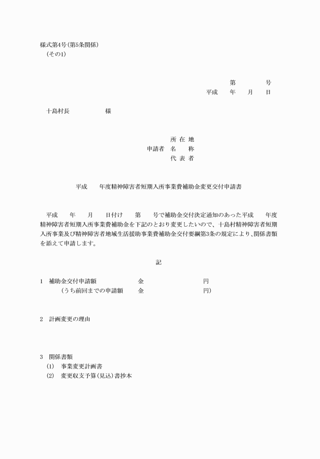 第3条 補助金の交付の申請をしようとする者(以下「補助事業者」という。)は、補助金等交付申請書(様式第1号)に次に掲げる書類を添えて、村長に対し提出しなければならない。