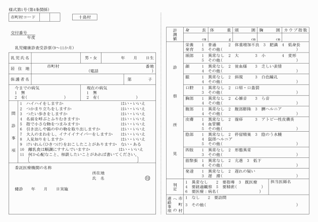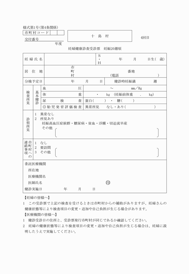 第4条 村長は、母子保健法(昭和40年法律第141号)第16条第1項の規定により母子健康手帳を交付するときに、健康診査受診票(様式第1号)を綴った健康診査受診票綴を交付するものとする。
