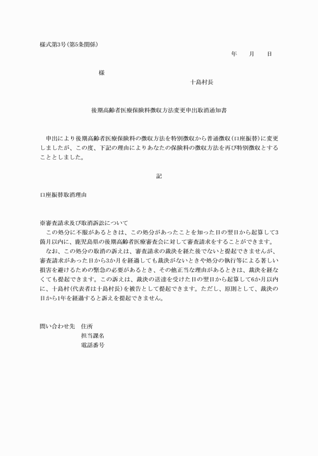 第2条 保険料の納付義務者(以下「納付義務者」という。)は、徴収方法の変更を申し出るときは、後期高齢者医療保険料徴収方法変更申出書(様式第1号)を十島村長に提出するものとする。