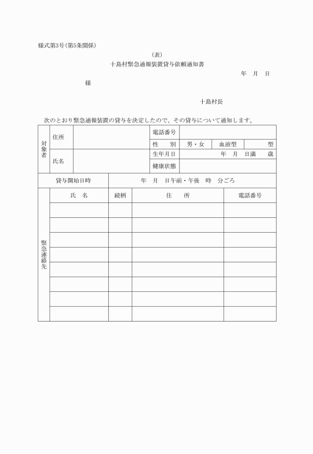 第5条 緊急通報装置の貸与を受けようとする者(以下「申請者」という。)は、あらかじめ十島村緊急通報装置貸与申請書(様式第1号)により、村長に申請しなければならない。
