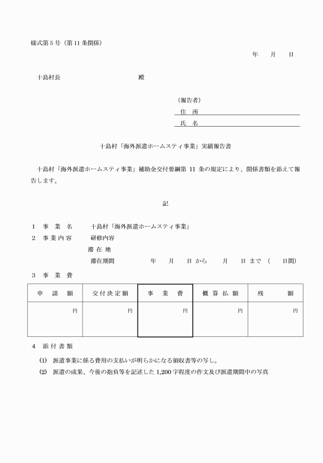 第11条 派遣生は、派遣事業終了後速やかに十島村「海外ホームスティ派遣事業」補助金実績報告書(様式第5号)を教育委員会に提出しなければならない。