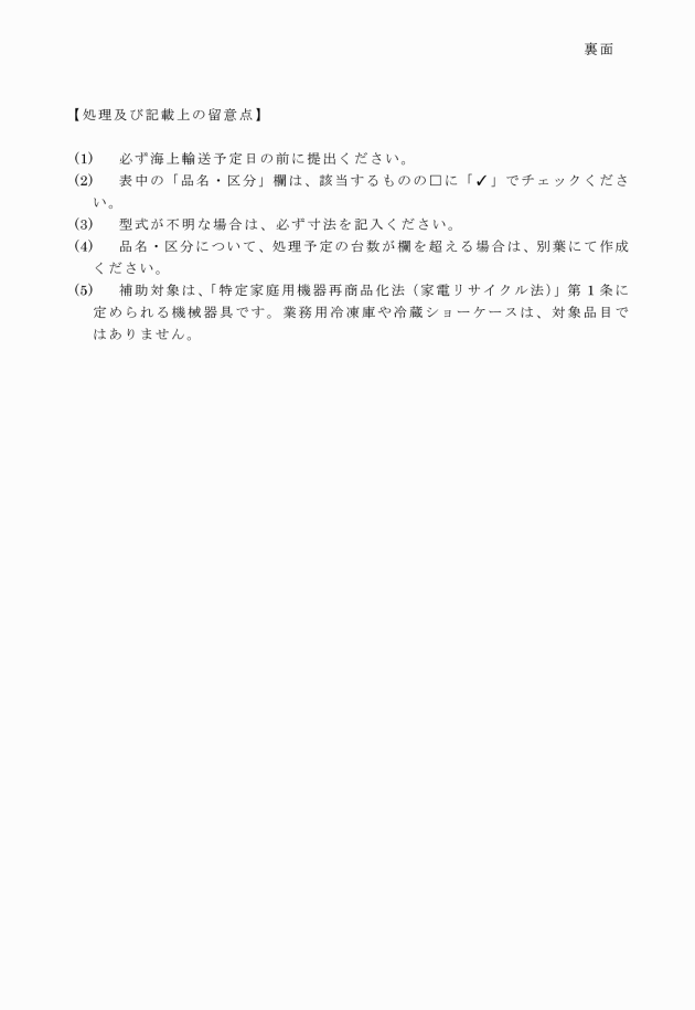 第4条 補助事業者は、対象廃棄物の特定海上輸送をおこなうときは、あらかじめ村長に特定家電廃棄物処理申込書(様式第1号)を届けなければならない。