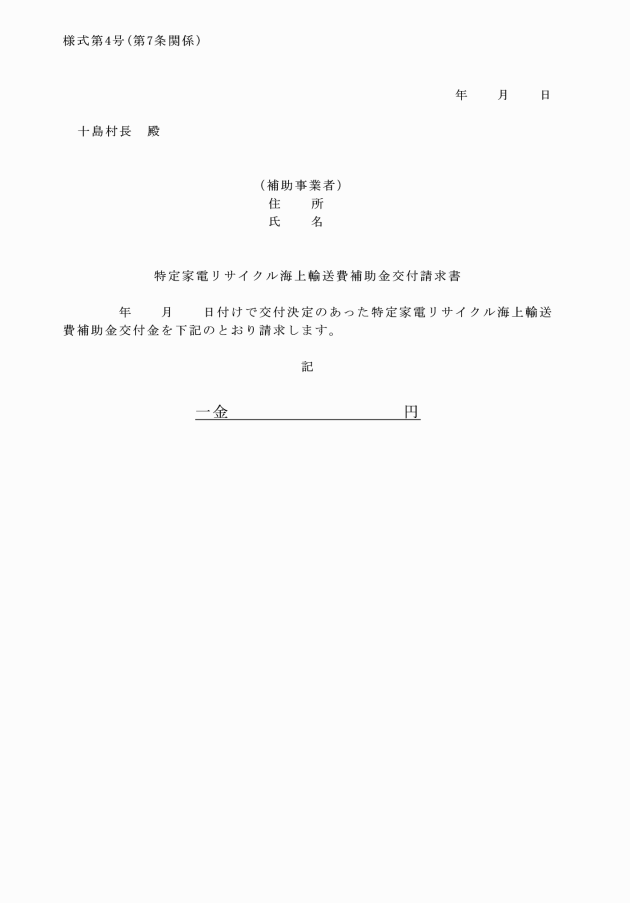第7条 補助事業者は、決定通知書を受理したときは、特定家電リサイクル海上輸送費補助金交付請求書(様式第4号)により村長に当該補助金の交付を請求することができる。