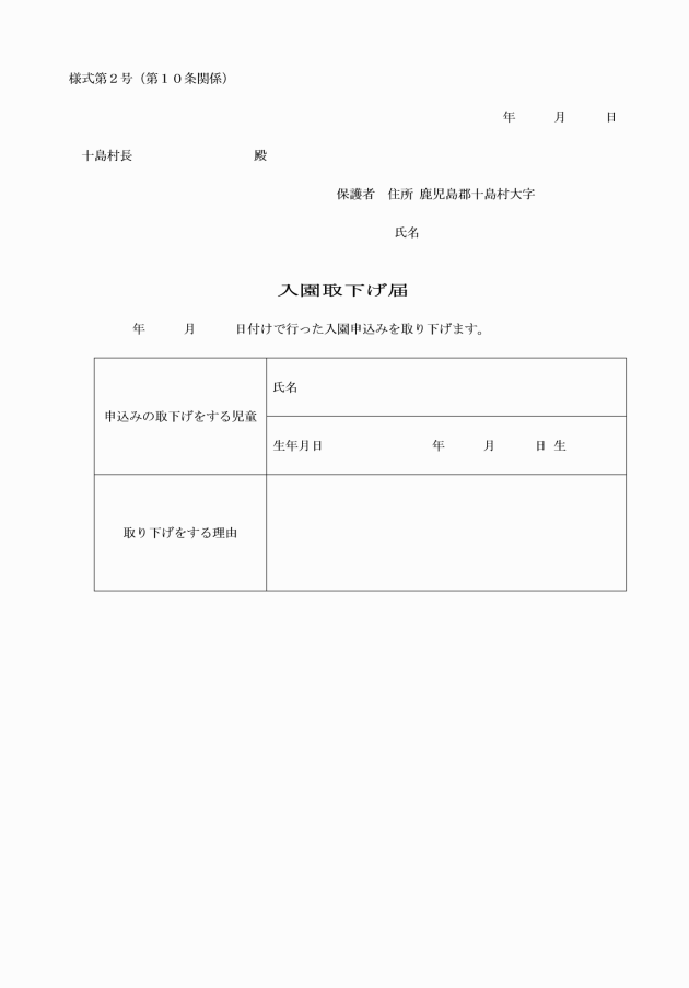 第10条 児童を園に入園させようとする保護者は入園申込書(様式第1号)に必要な事項を記入し、村長に提出しなければならない。