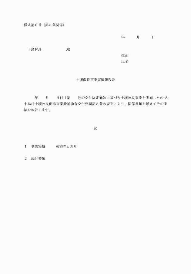 第8条 補助事業者は、事業が完了したときは、速やかに事業実績報告書(様式第8号)に次に掲げる書類を添えて村長に提出しなければならない。