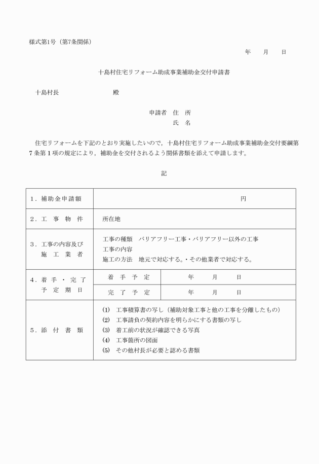 第7条 補助金の交付を受けようとする者(以下「申請者」という。)は、リフォームの着工前にと島村住宅リフォーム助成事業補助金交付申請書(様式第1号)に、次に掲げる書類を添付して村長に申請しなければならない。ただし、災害その他特別な事由により村長が特に必要と認めるときは、この限りでない。