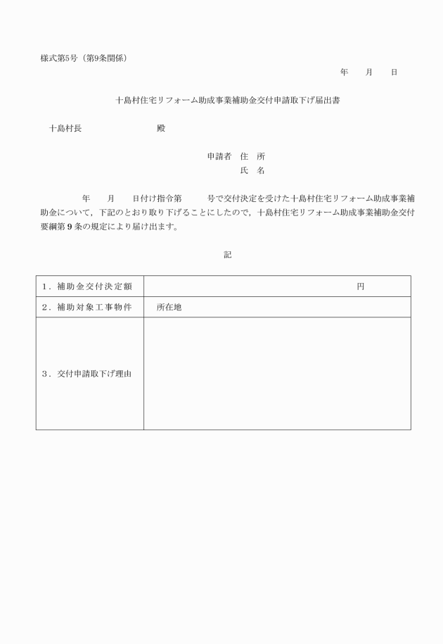 第9条 申請者が、補助金の交付申請を取り下げようとするときは、十島村住宅リフォーム助成事業補助金交付申請取下げ届出書(様式第5号)を村長に提出しなければならない。