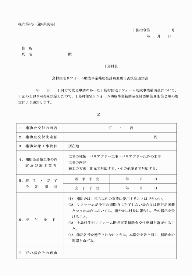 第8条 補助金の交付の決定を受けた者(以下「交付決定者」という。)は、リフォームの計画を変更しようとするときは、十島村住宅リフォーム助成事業補助金計画変更申請書(様式第3号)に、次に掲げる書類を添付して村長に申請しなければならない。