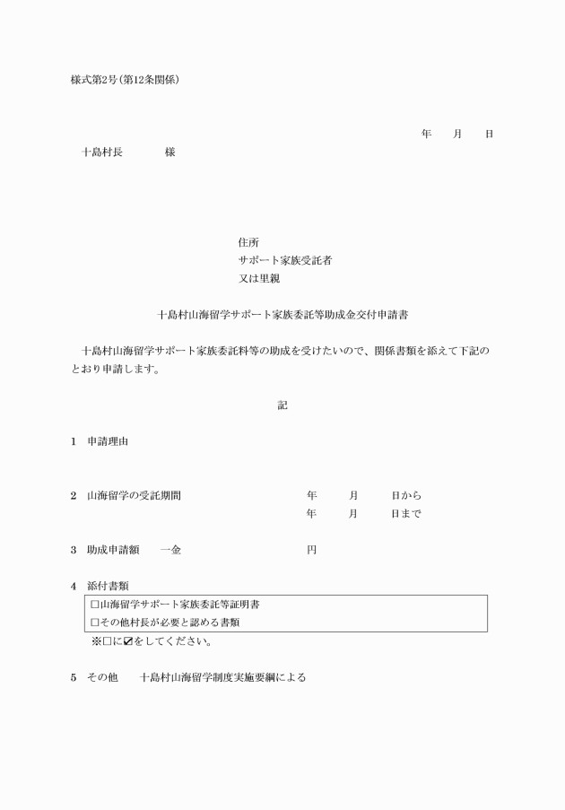 第14条 実親等及びサポート家族受託者は、助成金の請求をしようとするときは、十島村山海留学(サポート家族委託)助成金請求書(様式第6号)に決定通知書の写しを添えて、村長に提出しなければならない。