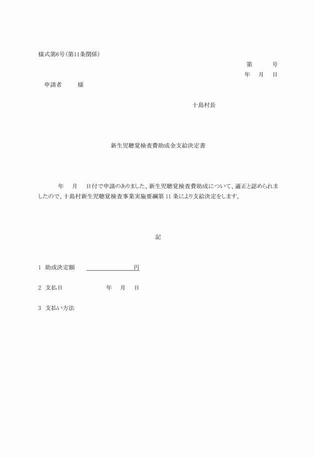 第5条 村長は、母子保健法(昭和40年法律第141号)第15条の規定による妊娠の届出を受理したときは、母子手帳の交付と合わせて、新生児聴覚検査受診票(様式第1号。以下「受診票」という。)を交付するものとする。