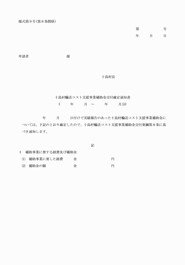 第9条 補助事業者は、補助金を請求しようとするときは、十島村輸送コスト支援事業補助金請求書(様式第10号)に村長が必要と認める書類を添えて村長に提出しなければならない。