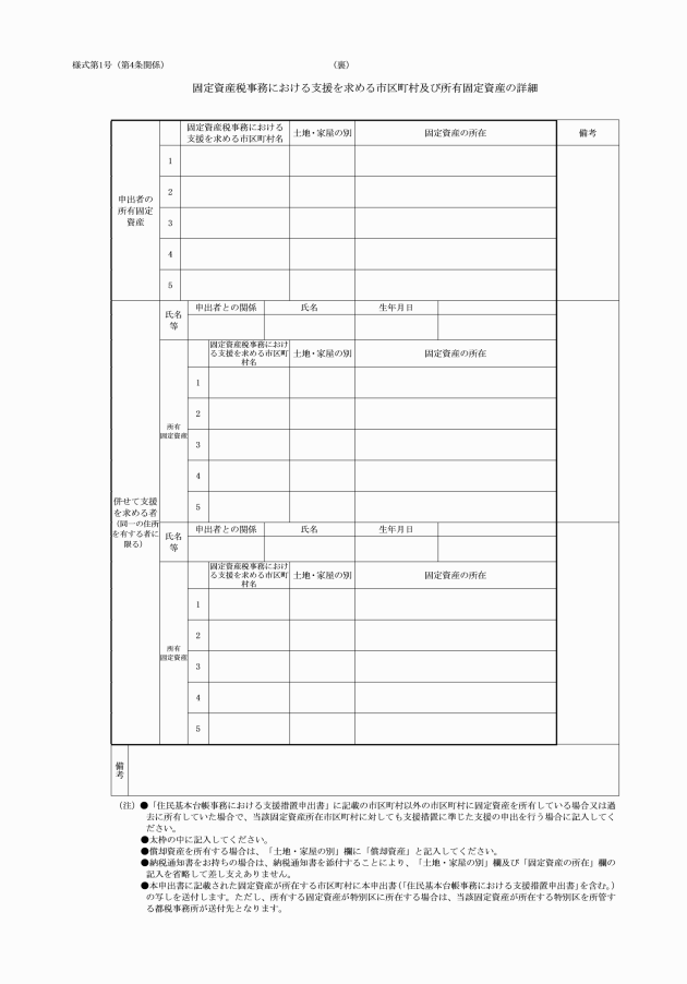 4 申出者は、他の市区町村においても支援措置を受けようとする場合は、その旨を申出書により村長に申し出ることができる。固定資産について、他の市区町村において所有している場合又は過去に所有していた場合も、同様とする。
