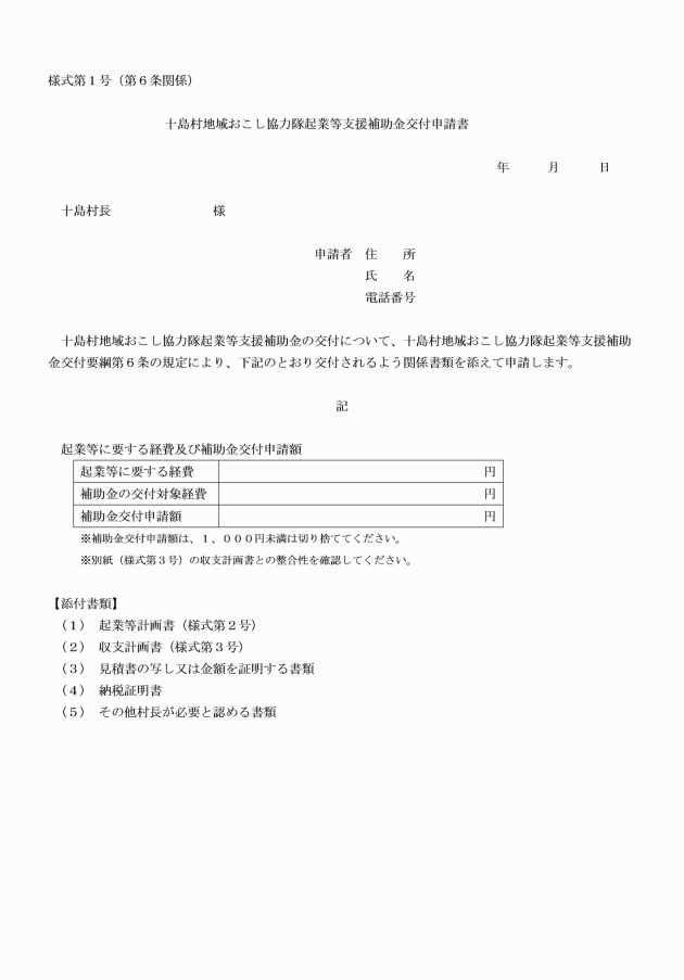 第6条 補助金の交付を受けようとする者(以下「申請者」という。)は、村長に十島村地域おこし協力隊起業等支援補助金交付申請書(様式第1号)に、次に掲げる書類を添付し提出しなければならない。
